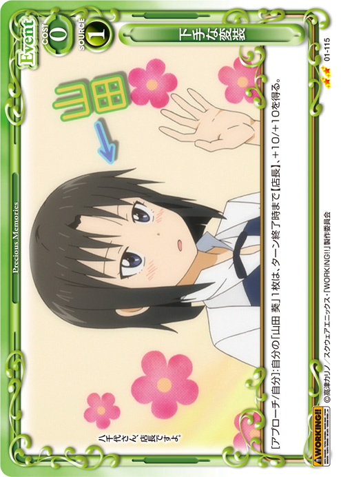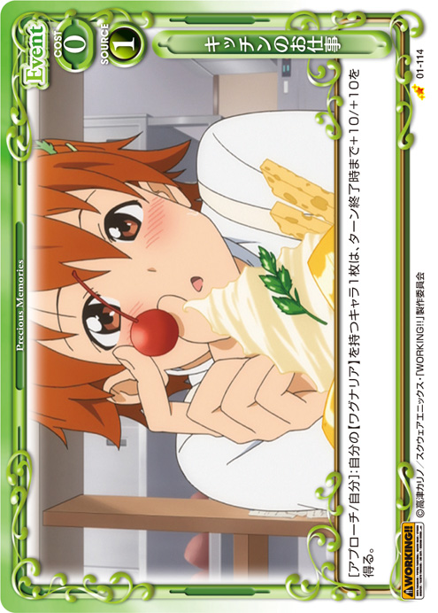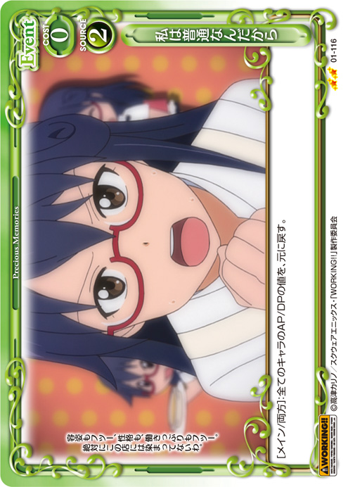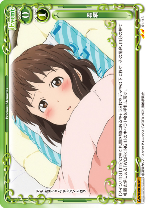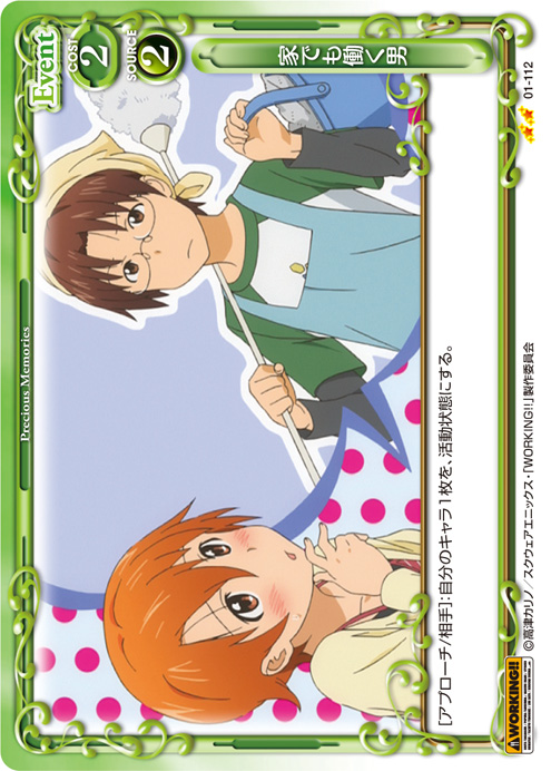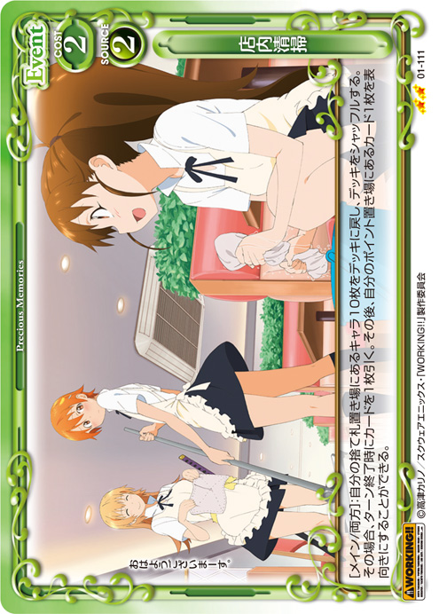 | [メイン/自分]:自分の捨て札置き場にあるキャラ2枚をデッキの下に移す。その場合、自分の捨て札置き場にある『WORKING!!』のキャラ1枚を手札に戻す。 | ||