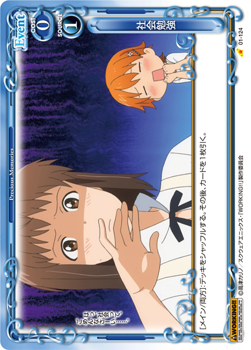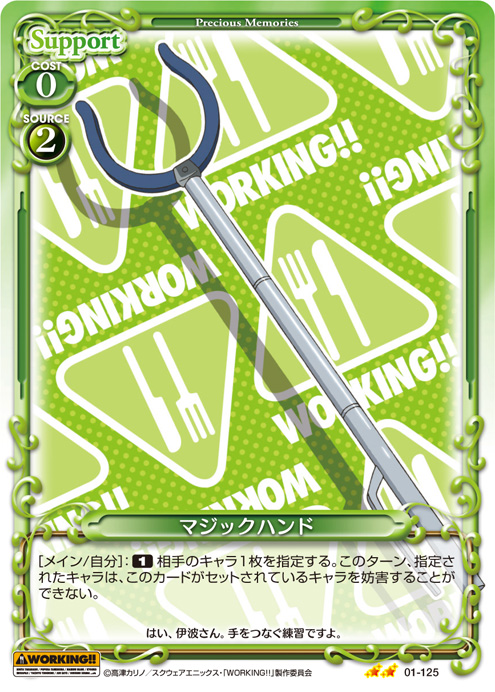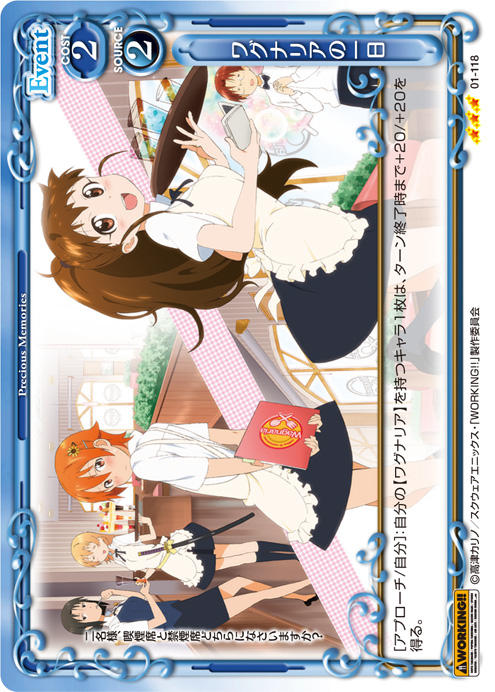| [アプローチ/自分]:自分の【ワグナリア】を持つキャラ1枚は、ターン終了時まで+20/+20を得る。 | ||