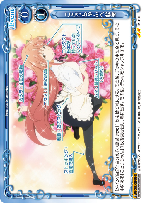 | [メイン/自分]:自分の「小鳥遊 宗太」1枚を捨て札にする。その後、デッキの中を全て見て、その中にある「ことりちゃん」1枚を抜き出し、場に出す。その後、デッキをシャッフルする。 | ||