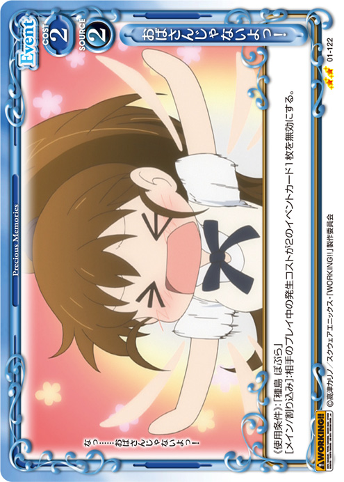 | 《使用条件》:「種島 ぽぷら」[メイン/割り込み]:相手のプレイ中の発生コストが2のイベントカード1枚を無効にする。 | ||