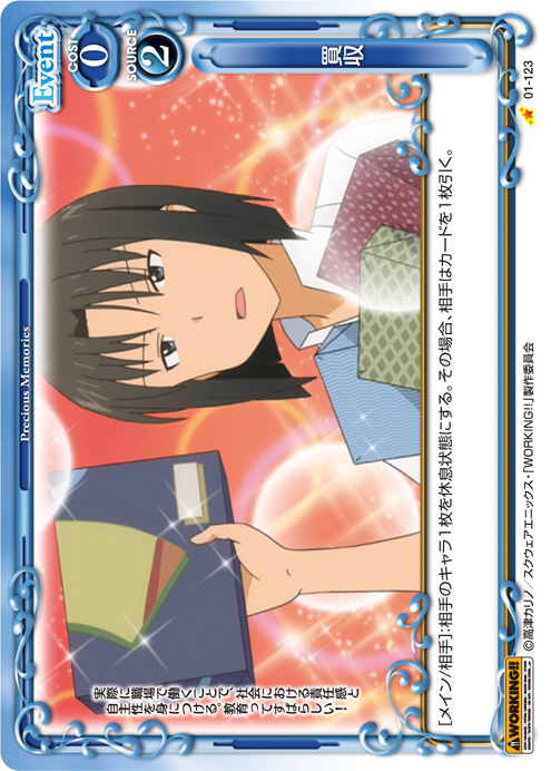 | [メイン/相手]:相手のキャラ1枚を休息状態にする。その場合、相手はカードを1枚引く。 | ||