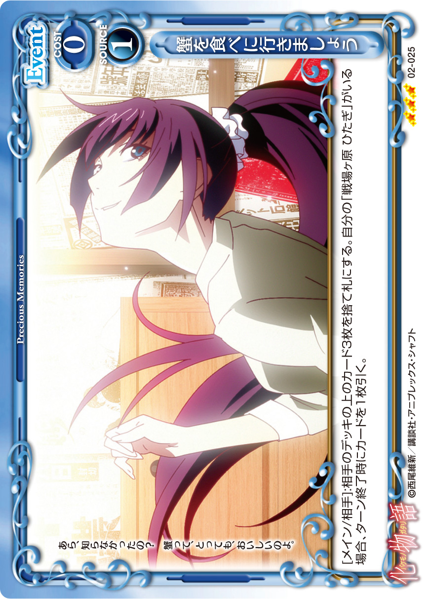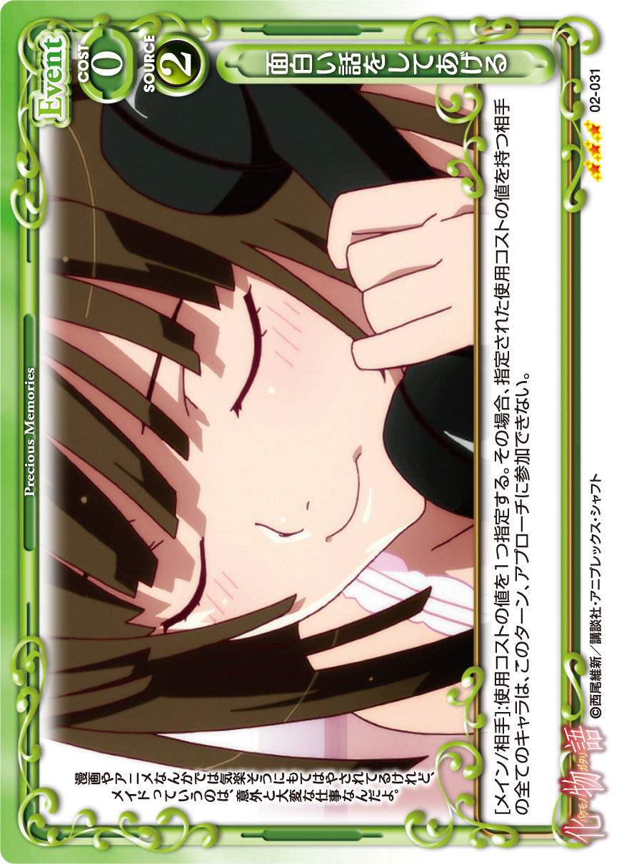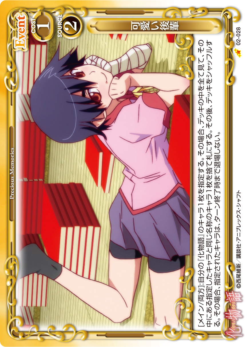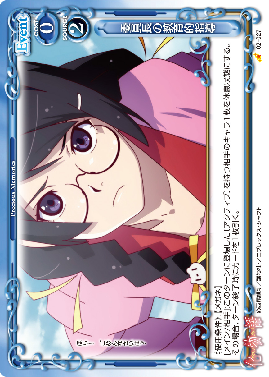 | [メイン/両方]:自分の『化物語』のキャラ1枚を指定する。その場合、デッキの中を全て見て、その中にある指定したキャラと同じ名称のキャラ1枚を捨て札にする。その後、デッキをシャッフルする。その場合、指定されたキャラは、ターン終了時まで退場しない。 | ||