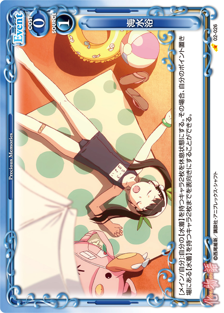 | [メイン/自分]:自分の【水着】を持つキャラ2枚を休息状態にする。その場合、自分のポイント置き場にある【水着】を持つキャラ2枚までを表向きにすることができる。 | ||