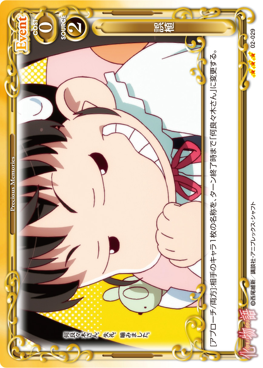 | [アプローチ/両方]:相手のキャラ1枚の名称を、ターン終了時まで「何良々木さん」に変更する。 | ||