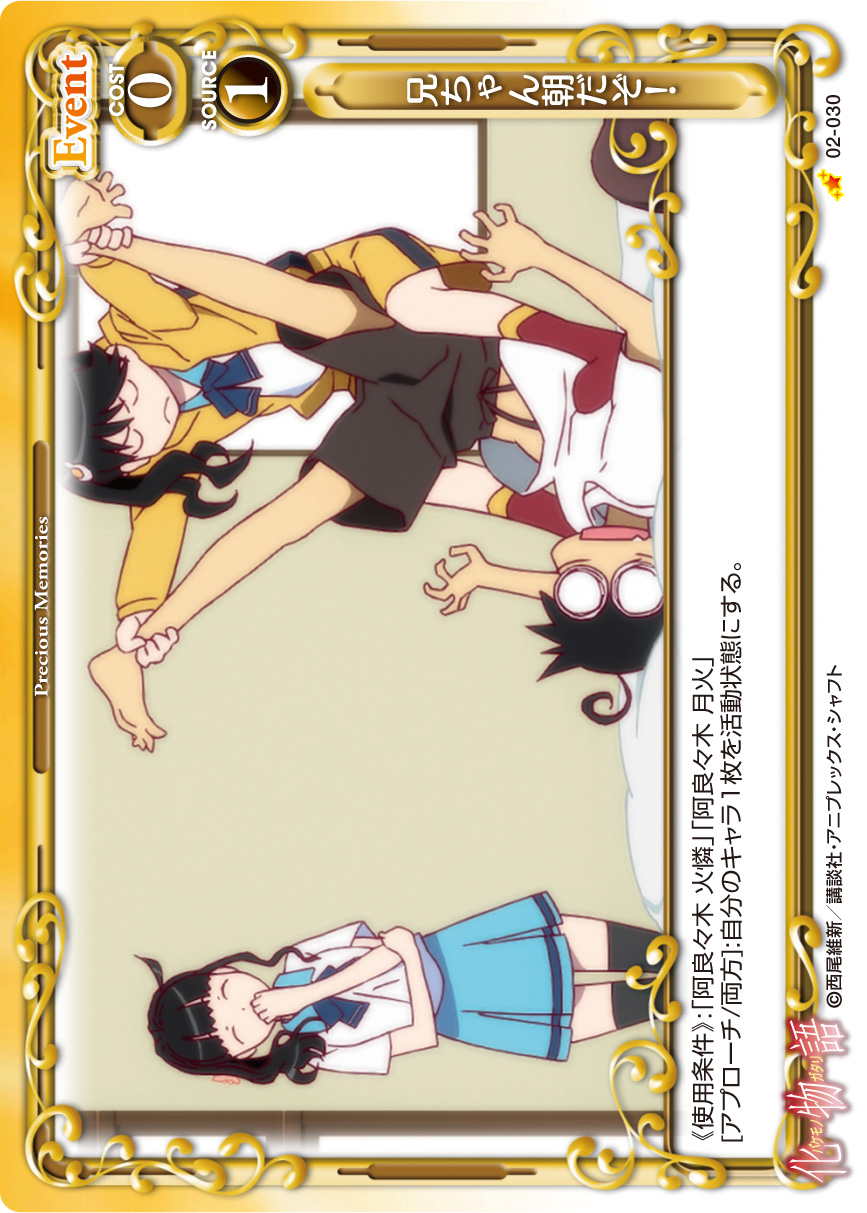| 《使用条件》:「阿良々木 火憐」「阿良々木 月火」[アプローチ/両方]:自分のキャラ1枚を活動状態にする。 | ||