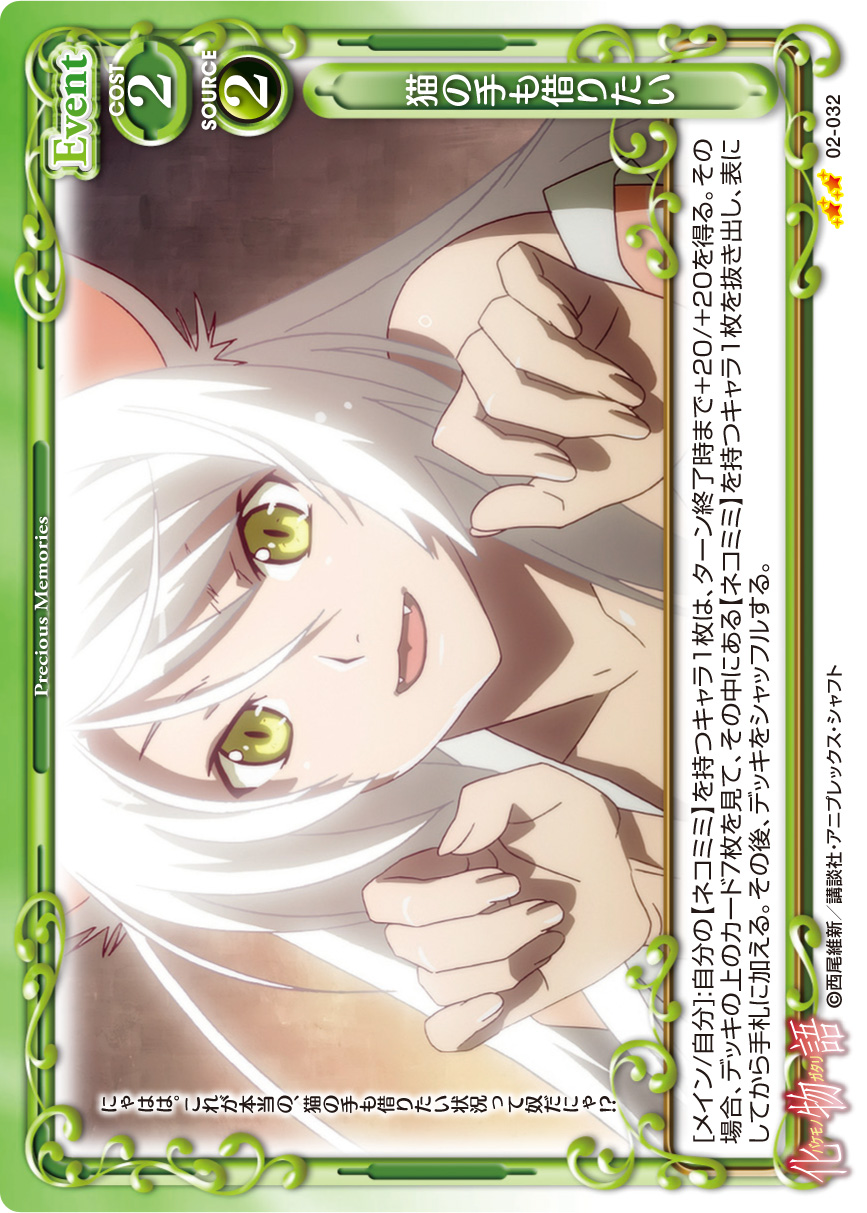| [メイン/自分]:自分の【ネコミミ】を持つキャラ1枚は、ターン終了時まで+20/+20を得る。その場合、デッキの上のカード7枚を見て、その中にある【ネコミミ】を持つキャラ1枚を抜き出し、表にしてから手札に加える。その後、デッキをシャッフルする。 | ||