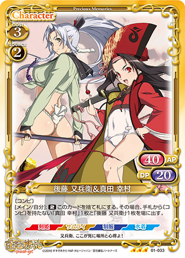 | 〔コンビ〕[メイン/自分]:《2》このカードを捨て札にする。その場合、手札から〔コンビ〕を持たない「真田 幸村」1枚と「後藤 又兵衛」1枚を場に出す。 | ||