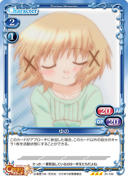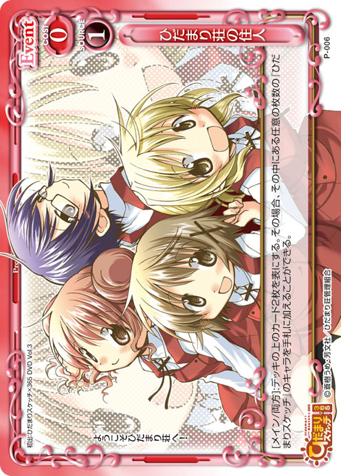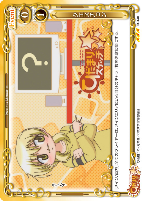 | [メイン/両方]:デッキの上のカード2枚を表にする。その場合、その中にある任意の枚数の『ひだまりスケッチ』のキャラを手札に加えることができる。 | ||