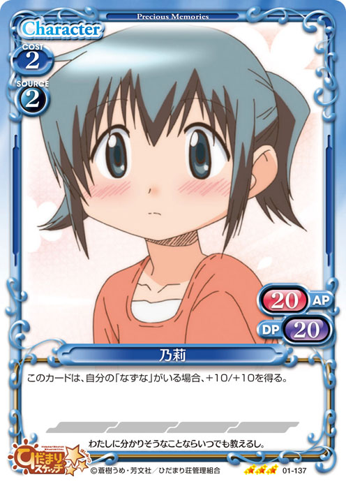 | このカードは、自分の「なずな」がいる場合、+10/+10を得る。 | ||