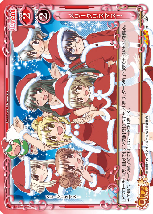| [アプローチ/両方]:自分の【サンタ服】を持つキャラ1枚は、ターン終了時まで+20/+20を得る。その場合、ターン終了時に相手はカードを1枚引く。 | ||