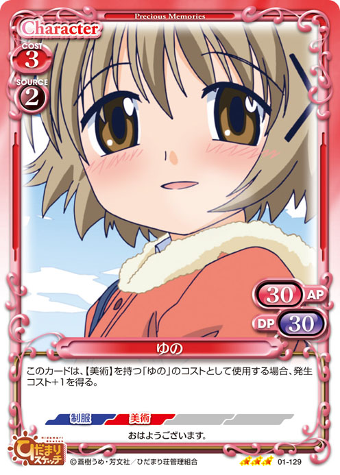 | このカードは、【美術】を持つ「ゆの」のコストとして使用する場合、発生コスト+1を得る。 | ||