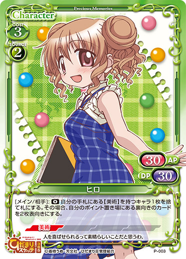| [メイン/相手]:《0》自分の手札にある【美術】を持つキャラ1枚を捨て札にする。その場合、自分のポイント置き場にある裏向きのカードを2枚表向きにする。 | ||