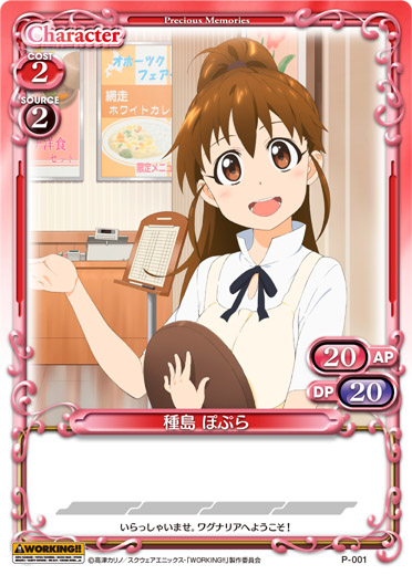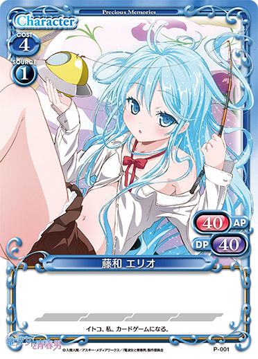 | このカードがアプローチでポイントを与えた場合、相手は手札1枚を捨て札にする。このカードは、APよりDPの値が低いキャラに妨害されている場合、退場しない。 | ||