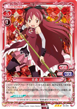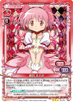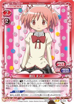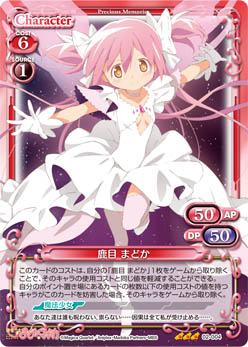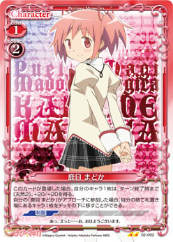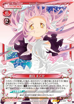 | このカードのコストは、自分の「鹿目 まどか」1枚をゲームから取り除くことで、そのキャラの使用コストと同じ値を軽減することができる。自分のポイント置き場にあるカードの枚数以下の使用コストの値を持つキャラがこのカードを妨害した場合、そのキャラをゲームから取り除く。 | ||