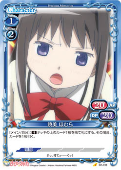 | このカードは、相手のアプローチフェイズにも登場させることができる。このカードが登場した場合、相手のキャラ1枚は、ターン終了時まで±0/-20を得る。 | ||