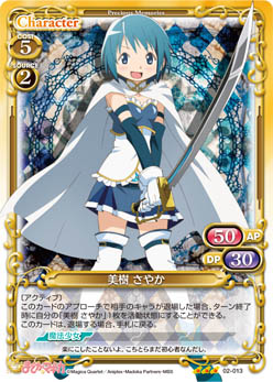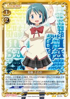 | 〔アクティブ〕このカードのアプローチで相手のキャラが退場した場合、ターン終了時に自分の「美樹 さやか」1枚を活動状態にすることができる。このカードは、退場する場合、手札に戻る。 | ||
