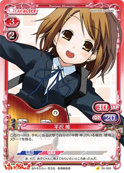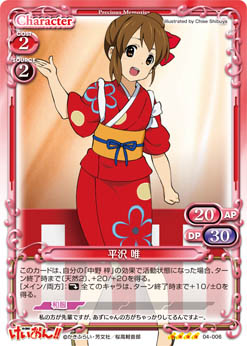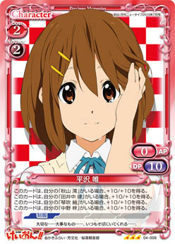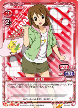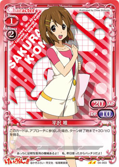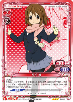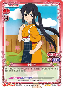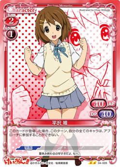 | このカードが登場した場合、手札からAPとDPの合計値が40以下の『けいおん!!』のキャラ1枚を場に出すことができる。 | ||