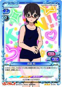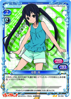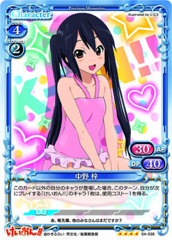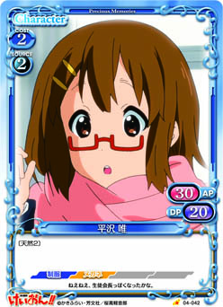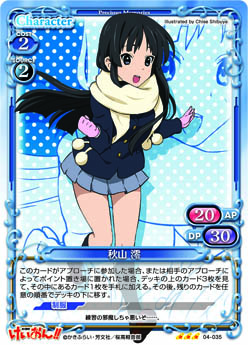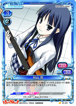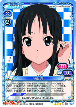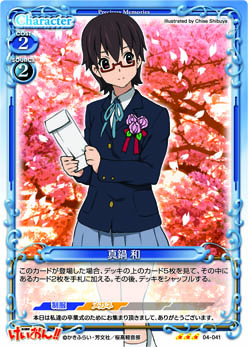 | このカード以外の自分のキャラが登場した場合、このターン、自分が次にプレイする『けいおん!!』のキャラ1枚は、使用コスト-1を得る。 | ||
