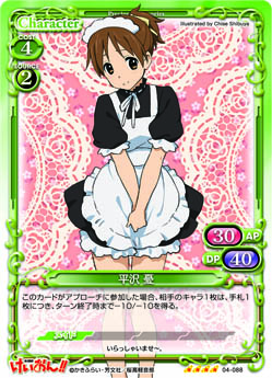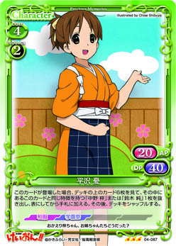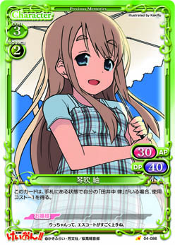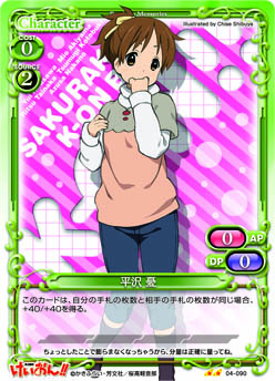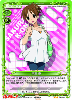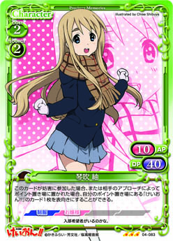 | このカードが妨害に参加した場合、または相手のアプローチによってポイント置き場に置かれた場合、自分のポイント置き場にある『けいおん!!』のカード1枚を表向きにすることができる。 | ||