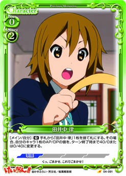 | [メイン/自分]:《0》手札から「田井中 律」1枚を捨て札にする。その場合、自分のキャラ1枚のAP/DPの値を、ターン終了時まで40/0または0/40に変更する。 | ||