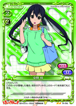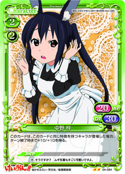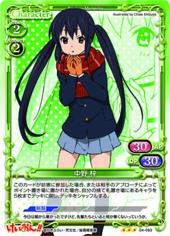 | このカードが登場した場合、自分の捨て札置き場にある『けいおん!!』のキャラ1枚を手札に戻すことができる。 | ||
