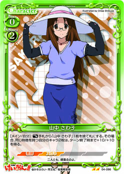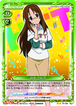 | [メイン/自分]:《休》手札から「山中 さわ子」1枚を捨て札にする。その場合、同じ特徴を持つ自分のキャラ2枚は、ターン終了時まで+10/+10を得る。 | ||