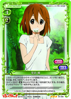 | このカード以外の自分のキャラが退場するごとに、カードを1枚引く。その後、手札1枚をデッキの下に移す。[メイン/自分]:《0》手札から「平沢 唯」1枚を捨て札にする。その場合、デッキの下のカード1枚を手札に加える。 | ||