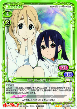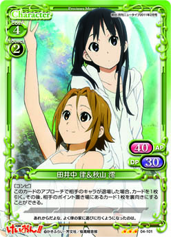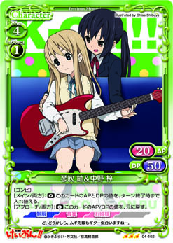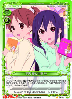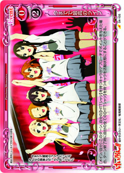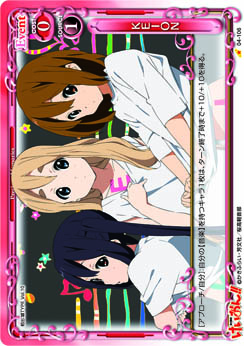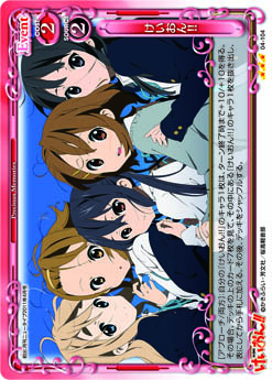 | [アプローチ/両方]:自分の『けいおん!!』のキャラ1枚は、ターン終了時まで+10/+10を得る。その場合、デッキの上のカード7枚を見て、その中にある『けいおん!!』のキャラ1枚を抜き出し、表にしてから手札に加える。その後、デッキをシャッフルする。 | ||