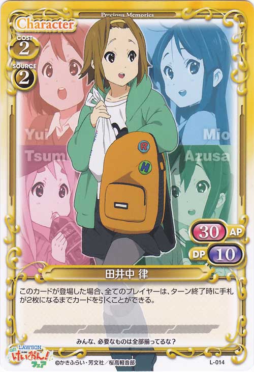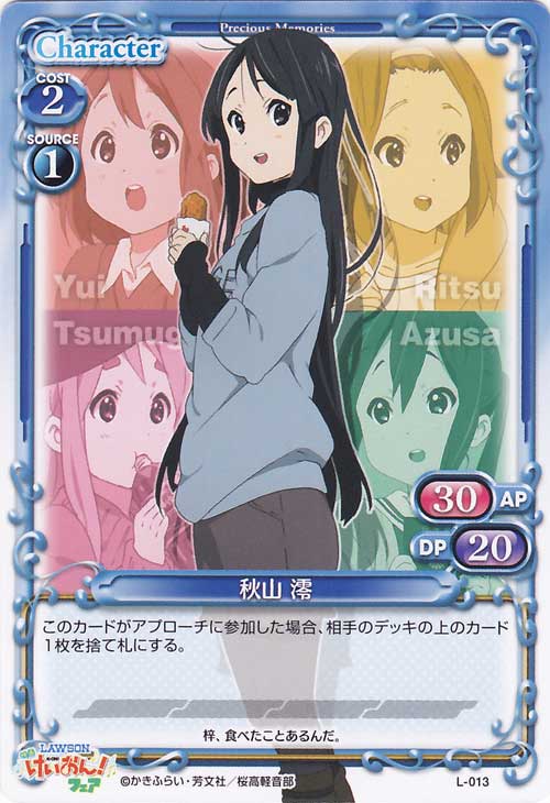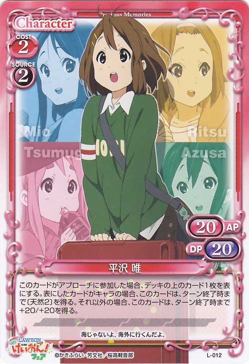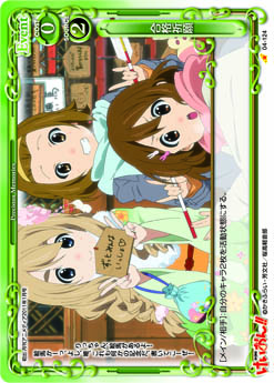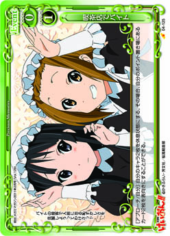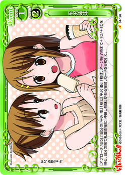| [アプローチ/自分]:自分の「平沢 唯」1枚と「平沢 憂」1枚は、ターン終了時まで+10/+10を得る。自分の捨て札置き場に「仲良し姉妹」がある場合、カードを2枚引く。 | ||