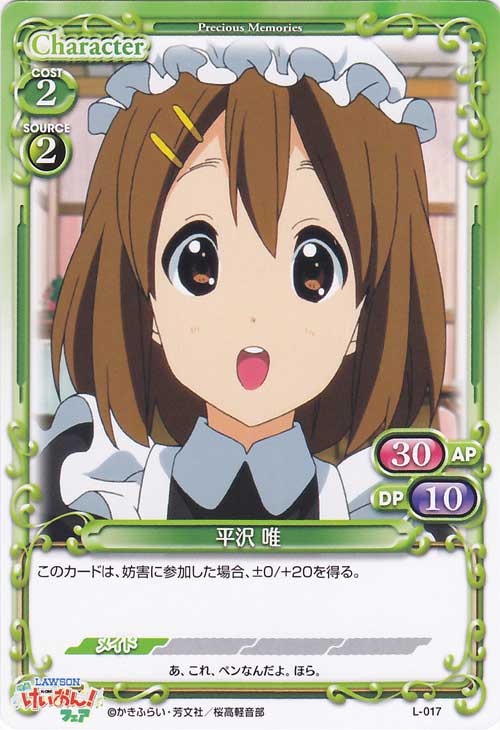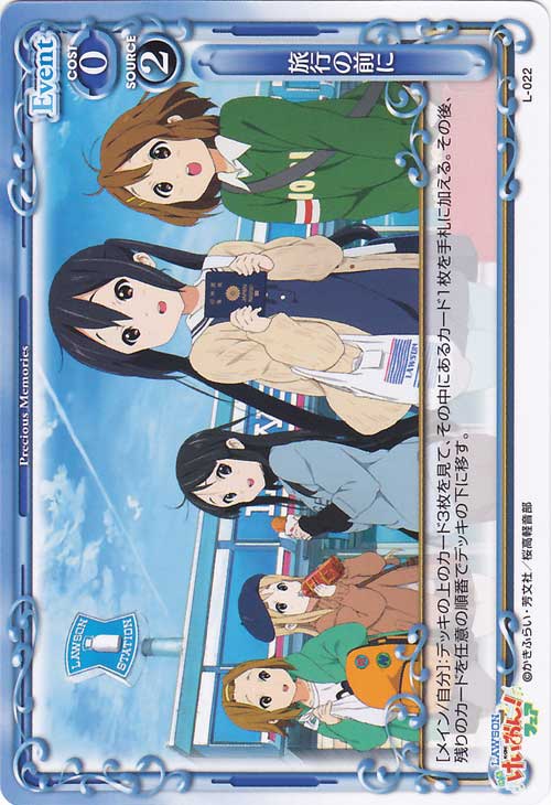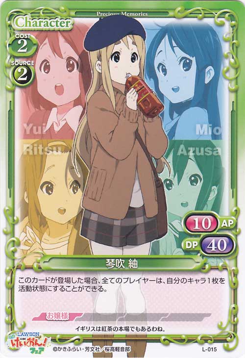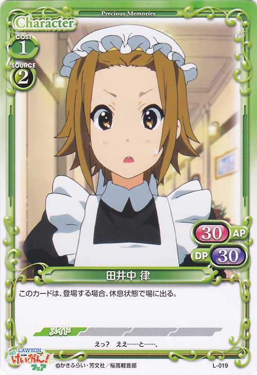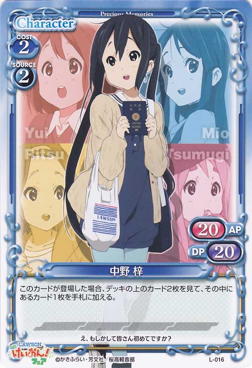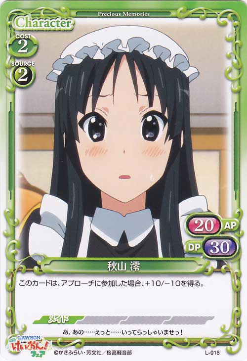 | 自分の「秋山 澪」または「田井中 律」が登場した場合、カードを一枚引く。その後、手札1枚をデッキの下に移す。 | ||