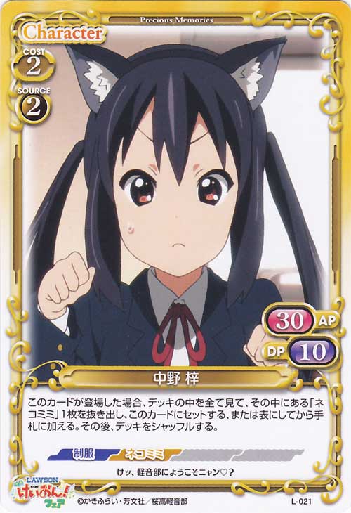 | このカードが登場した場合、デッキの中を全て見て、その中にある「ネコミミ」1枚を抜き出し、このカードにセットする。または表にしてから手札に加える。その後、デッキをシャッフルする。 | ||