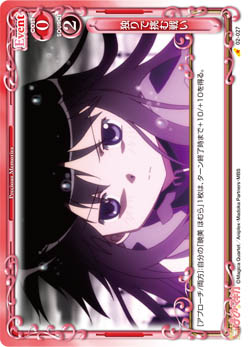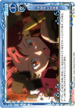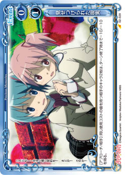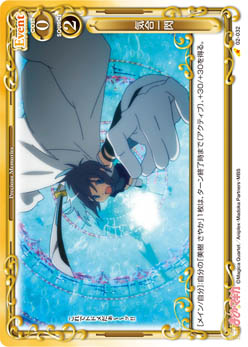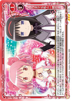 | [アプローチ/自分]:自分の捨て札置き場にある「鹿目 まどか」または「暁美 ほむら」1枚をゲームから取り除く。その場合、自分の「鹿目 まどか」または「暁美 ほむら」1枚は、ターン終了時までゲームから取り除いたキャラのAP/DPと同じ値のAP/DPの修正を得る。 | ||