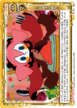 | [アプローチ/相手]:相手のキャラ1枚は、ターン終了時まで±0/-10を得る。その場合、デッキの中を全て見て、その中にある「不覚」1枚を抜き出し、表にしてから手札に加える。その後、デッキをシャッフルする。このターン、自分が次にプレイする「不覚」1枚は、使用コスト-3を得る。 | ||