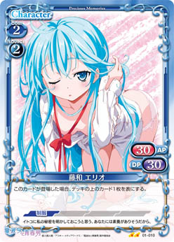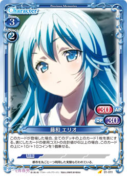 | このカードがアプローチまたは妨害に参加した場合、自分の捨て札置き場にあるキャラを3枚までデッキに戻し、デッキをシャッフルする。 | ||