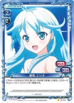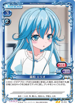 | 自分のキャラが登場した場合、自分の『電波女と青春男』のキャラ1枚は、ターン終了時まで+10/+10を得る。このターン、そのキャラがアプローチでポイントを与えた場合、カードを1枚引く。 | ||