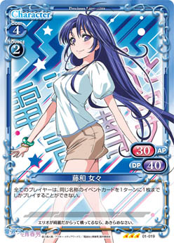 | このカードが登場した場合、相手のキャラ1枚は、ターン終了時まで-30/-30を得る。 | ||