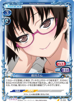 | このカードが登場した場合、デッキの上のカード3枚を見て、その中にある【メガネ】を持つキャラを2枚まで抜き出し、表にしてから手札に加える。その後、残りのカードを任意の順番でデッキの下に移す。 | ||