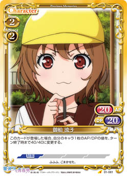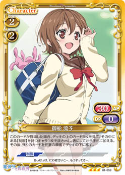 | このカードが登場した場合、デッキの上のカード5枚を見て、その中にある【制服】を持つキャラ1枚を抜き出し、表にしてから手札に加える。その後、残りのカードを任意の順番でデッキの下に移す。 | ||
