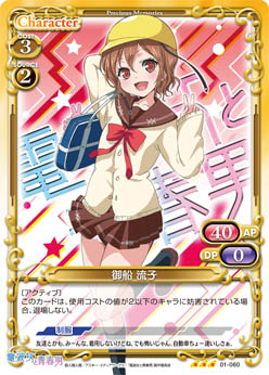 | このカードが登場した場合、自分のキャラ1枚のAP/DPの値を、ターン終了時まで40/40に変更する。 | ||