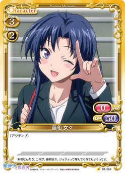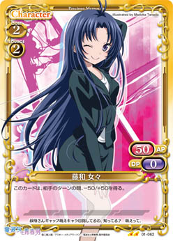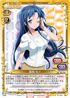 | このカードが登場した場合、デッキの上のカード4枚を見て、その中にある「藤和 エリオ」1枚を抜き出し、表にしてから手札に加える。このカードが妨害された場合、手札から「藤和 女々」1枚を表にする。その場合、このカードは、ターン終了時まで+20/+20を得る。 | ||