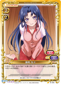 | このカードが登場した場合、相手のキャラ1枚は、ターン終了時まで±0/-40を得る。 | ||
