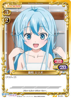 | このカードが登場した場合、デッキの上のカード2枚を見て、その中にある『電波女と青春男』のキャラ1枚を抜き出し、表にしてから手札に加える。その後、残りのカードを任意の順番でデッキの下に移す。 | ||