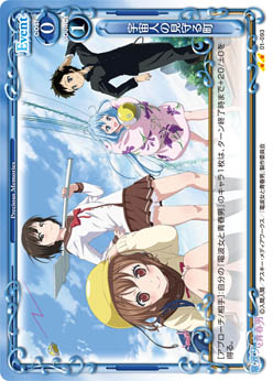 | 《使用条件》:自分の【水着】を持つキャラ3枚以上。[メイン/両方]:手札から【水着】を持つキャラ1枚を場に出す。 | ||