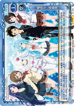 | [メイン/自分]:自分の「藤和 エリオ」1枚と「藤和 女々」1枚は、ターン終了時まで+10/+10を得る。その場合、相手は自分のキャラ1枚を休息状態にする。 | ||