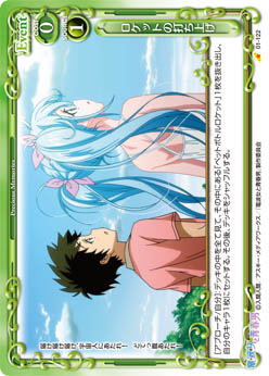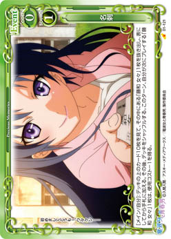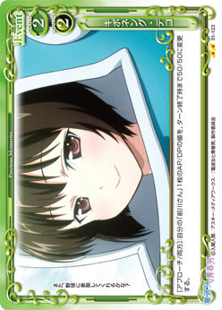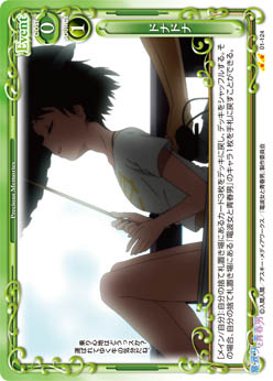 | [メイン/自分]:デッキの上のカード10枚を見て、その中にある「藤和 女々」1枚を抜き出し、表にしてから手札に加える。その後、デッキをシャッフルする。このターン、自分が次にプレイする「藤和 女々」1枚は、使用コスト-1を得る。 | ||