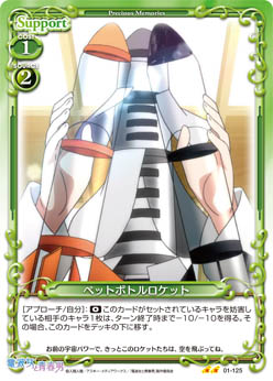 | [アプローチ/自分]:デッキの中を全て見て、その中にある「ペットボトルロケット」1枚を抜き出し、自分のキャラ1枚にセットする。その後、デッキをシャッフルする。 | ||