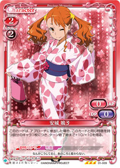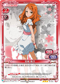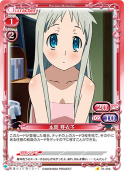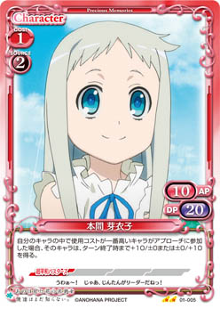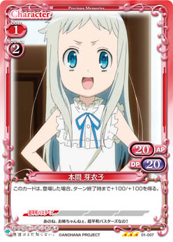 | このカードは、自分の「宿海 仁太」がいる場合、+10/+10を得る。このカードがアプローチでポイントを与えた場合、自分の捨て札置き場にあるキャラ1枚を手札に戻すことができる。 | ||