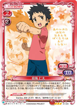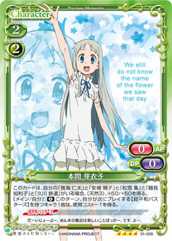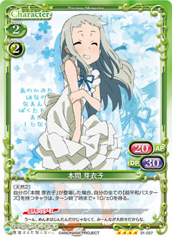 | このカードは、自分の「本間 芽衣子」がいる場合、可能な限りアプローチに参加しなくてはならない。このカードは、自分の「本間 芽衣子」がいる場合、+20/+20を得る。 | ||