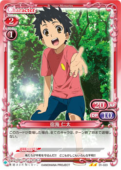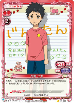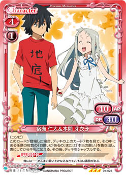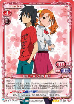 | 〔天然2〕自分の「本間 芽衣子」が登場した場合、自分の全ての【超平和バスターズ】を持つキャラは、ターン終了時まで+10/±0を得る。 | ||