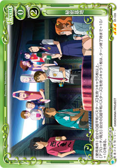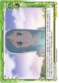 | [メイン/自分]:デッキの上のカード1枚を表にする。表にしたカードが「本間 芽衣子」の場合、ターン終了時に自分の全てのキャラを活動状態にする。このターン、自分が「かくれんぼ」をプレイしている場合、自分の全てのキャラは、ターン終了時まで退場しない。 | ||